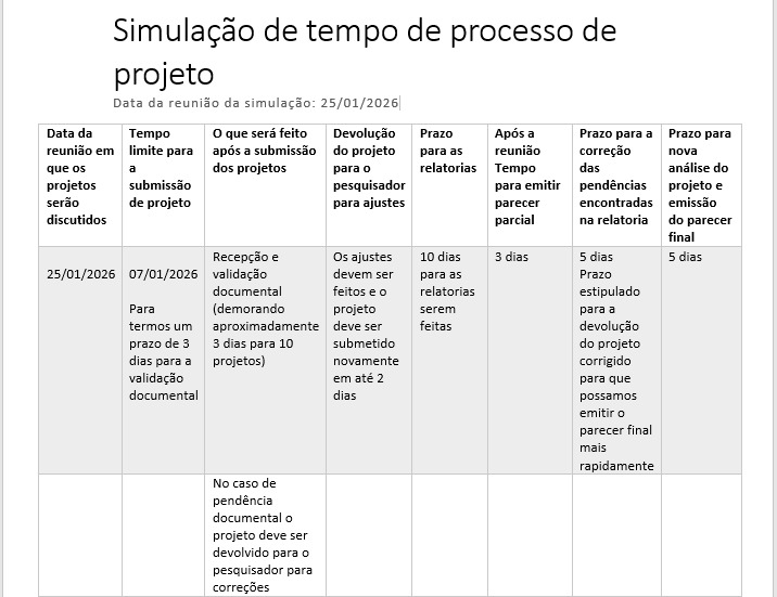 A tabela abaixo apresenta uma simulação dos prazos estimados para cada etapa do processo de submissão e avaliação de projetos pelo CEPDocumentos Obrigatórios para a Submissão de Projetos de Pesquisa na Plataforma Brasil/UNIGOYAZES